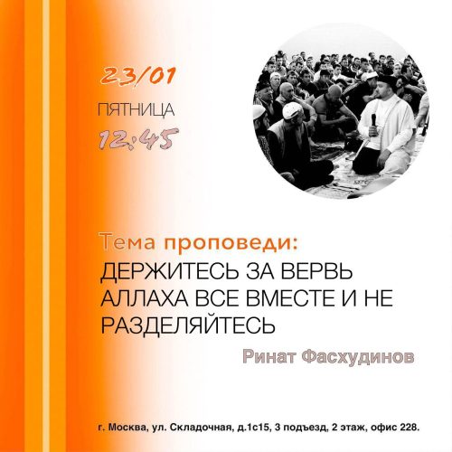 22 января 2026 года в Центре Марджани при МИРО СВАО города Москвы «Ихсан» состоится пятничная проповедь Рината Фасхудинова, которая будет посвящена месту джамаата в исламе. Эта тема, как никогда актуальная в современном мире, полном разобщенности и индивидуализма, требует тщательного осмысления и глубокого понимания. Джамаат является одной из ключевых концепций исламского учения, и его роль в жизни мусульманина трудно переоценить. Пророк Мухаммад ﷺ говорил: «Поистине, Аллах доволен тремя вещами, исходящими от вас. А также три вещи порицает. Вызывает довольство Бога вами, когда вы поклоняетесь [только] Ему; когда никого и ничего не возводите на Его Божественный уровень и когда держитесь за вервь Аллаха все вместе и не разделяетесь. Вызывают Божье недовольство пустословные разговоры, многочисленные вопросы, а также потеря богатства (неэкономное и неразумное использование ресурсов)» [Муслим].