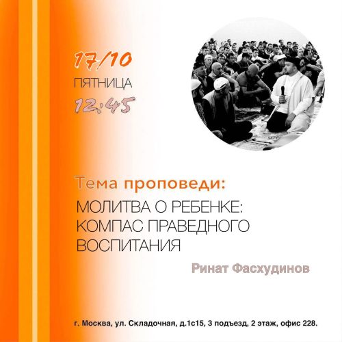 В пятницу, 17 октября, Ринат Фасхудинов проведет очередную проповедь в Центре Марджани, посвященную глубокому смыслу молитвы о ребенке, приведенной известным татарским языковедом, педагогом, исламоведом, политическим и общественным деятелем Ахмадом Хади Максуди в его труде «Гыйбадат Исламия»: » Аллаһым, бу баланы изгеләрдән кыл һәм аңа күркәмлек белән Ислам динендә үсәргә насыйп ит, аңа бу дөньяда да, ахирәттә дә бәхетле булырга насыйп ит». Эта краткая, но емкая молитва заключает в себе руководство для родителей, стремящихся воспитать достойное поколение.