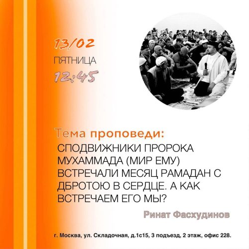 Пятничная проповедь Рината Фасхудинова, которая будет прочитана сегодня, 13 февраля 2026 года, в Центре Марджани будет посвящена вопросу подготовки верующего и его семьи к приходу Рамадан, ин ша Аллах. Когда у Абдуллаха ибн Масуда (да будет доволен им Всевышний) однажды спросили: «Как вы встречали священный месяц Рамадан?» Он ответил: «Никто из нас не осмеливался встречать этот месяц, питая хотя бы малейшую ненависть (озлобленность) к брату-мусульманину» [Хафиз Ибн Раджаб аль-Ханбали в «Лятаиф аль-маариф»].