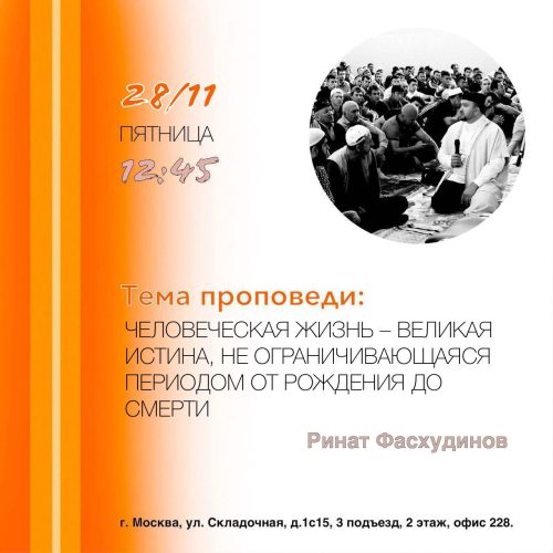 В пятницу, 28 ноября, Ринат Фасхудинов выступит с очередной проповедью перед прихожанами Центра Марджани. В благословенный день аль-Джума он планирует напомнить себе и верующим о том, что земная жизнь человека — это путешествие в вечность. Путешествие, которое начинается с момента рождения и заканчивается с последним вздохом, но истинное его завершение, подлинное возвращение домой, происходит только в мире вечном. Пророк Мухаммад ﷺ говорил: